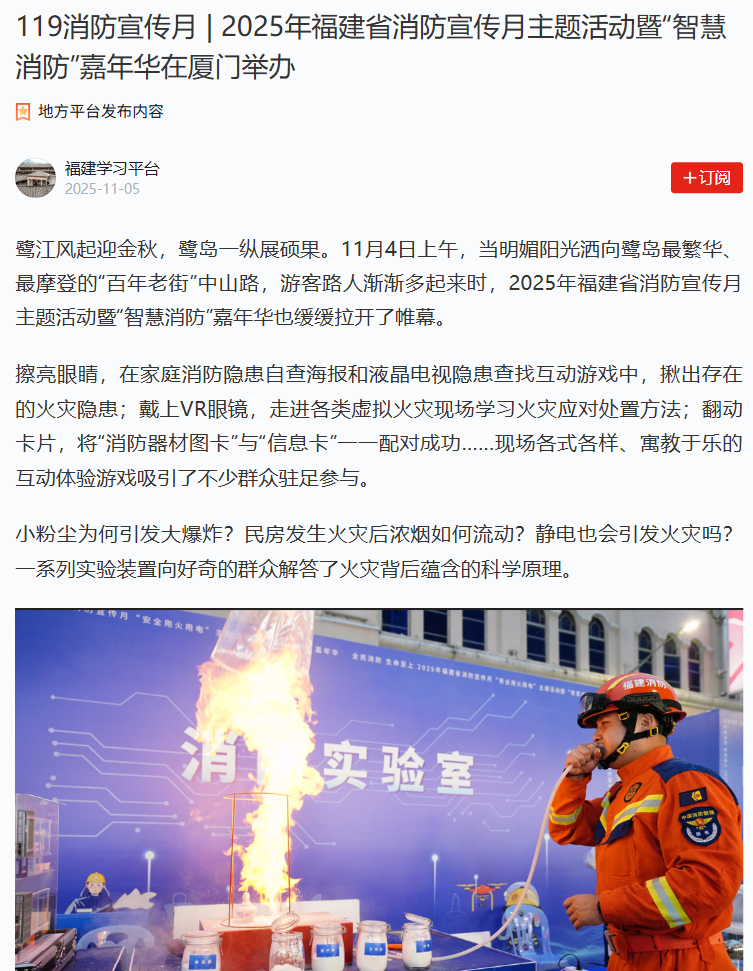 《众公协力齐“消防”》《蓝朋友听我说》《魔力火焰蓝》……当鹭江微风伴随着莆仙俚歌说唱、脱口秀趣梗、魔术表演等文化节目串烧,消防安全更“接地气”。福建省各地消防部门立足本地传统地域和潮流文化特色,推出一系列消防科普文化作品,让消防安全在文化浸润中更好走向群众身边,打通基层末梢宣传“最后一公里”。