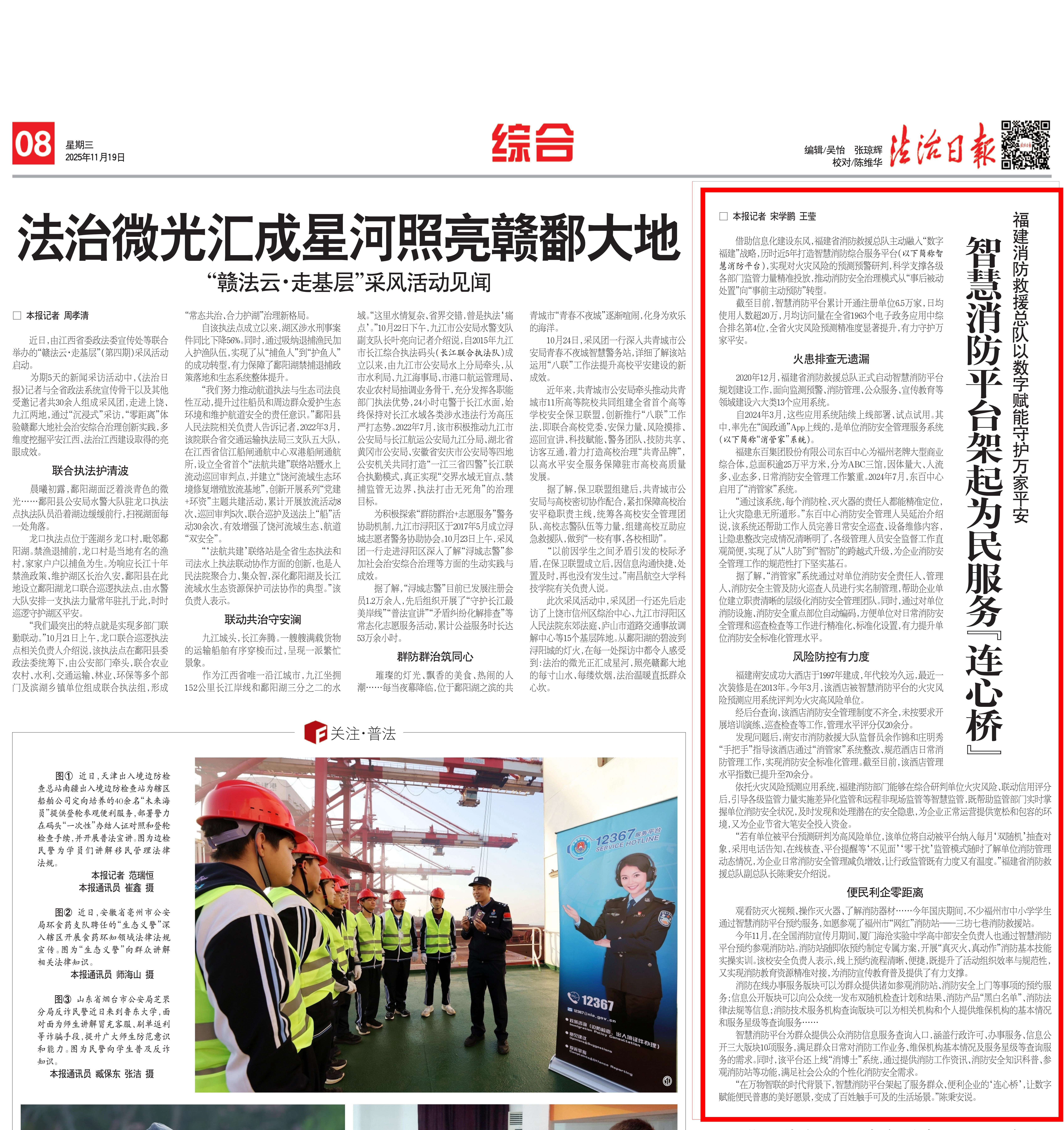 11月19日,《法治日报》报道《福建消防救援总队以数字赋能守护万家平安 智慧消防平台架起为民服务“连心桥”》,介绍“智慧消防”平台实现火患排查无遗漏、风险防控有力度、便民利企零距离三大成效。