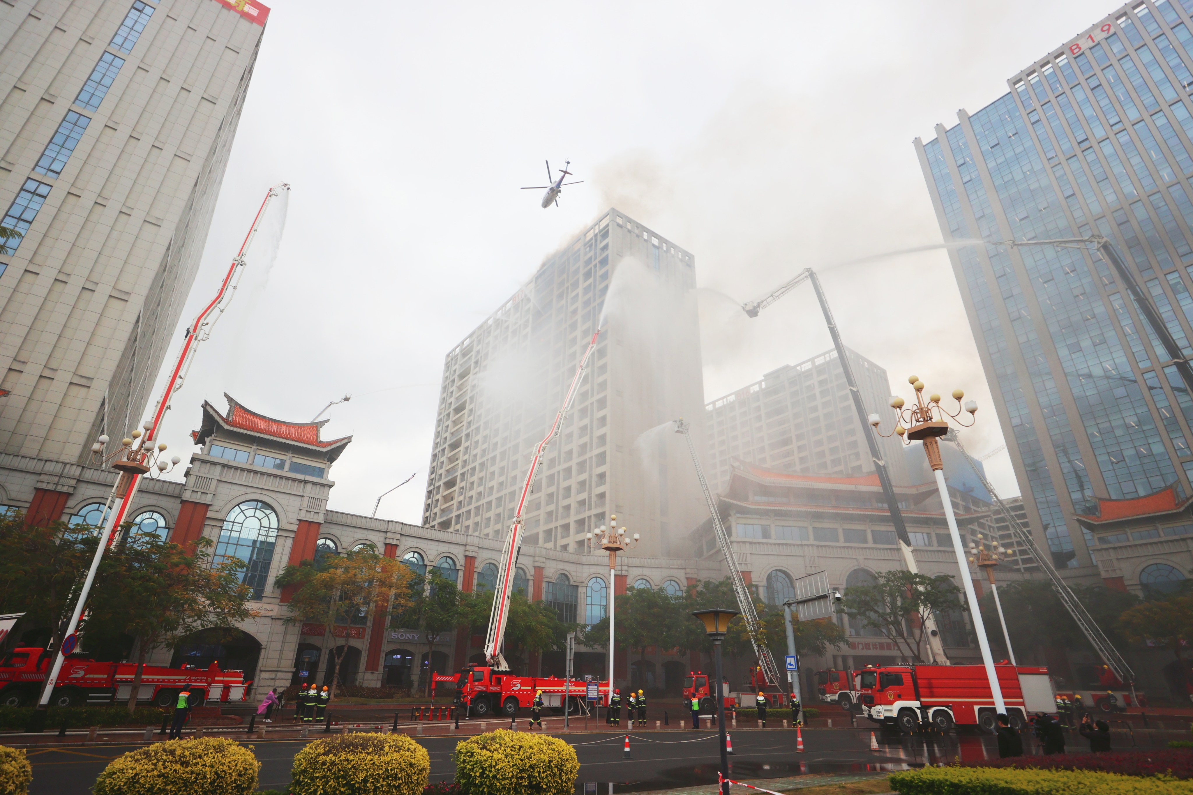在灭火实战演练环节,消防救援队伍全面呈现了一场专业化的灭火救援实战场景。在灭火实战演练环节,模拟某公寓14层发生火灾,以“模拟演练+现场解说”身临其境的方式向群众科普讲解应该如何开展初起火灾扑救、逃生和单位如何组织火灾扑救和人员疏散。同时,火警信息通过物联感知系统第一时间传送至厦门支队消防指挥中心。火势迅速蔓延,飞火引燃裙楼,形成全面燃烧态势。人员紧急疏散后仍有十余人被困,情况万分危急!省消防救援总队一次性调集厦门、漳州、泉州消防救援支队高层建筑灭火救援专业队和福州支队空勤力量、三明支队无人作战力量,总队全勤遂行出动,并协调应急、公安、医疗、市政、电信及交通运输部东海第二救助飞行队等相关联动力量协同开展救援。针对高层建筑火灾扑救中存在的“登高难、搜索难、疏散难、控火难、排烟难”五大问题,立足最大最难最不利条件,演练设置初期处置、响应升级、人员搜救、内外控火和创新装备应用等20余个实战科目并串联成完整的“灾情链”,全面检验复杂条件下多部门应急响应、协同作战和福建省消防救援队伍从智能侦察到精准打击,从科学救援到体系保障,从人机协同到科技赋能的综合作战能力。