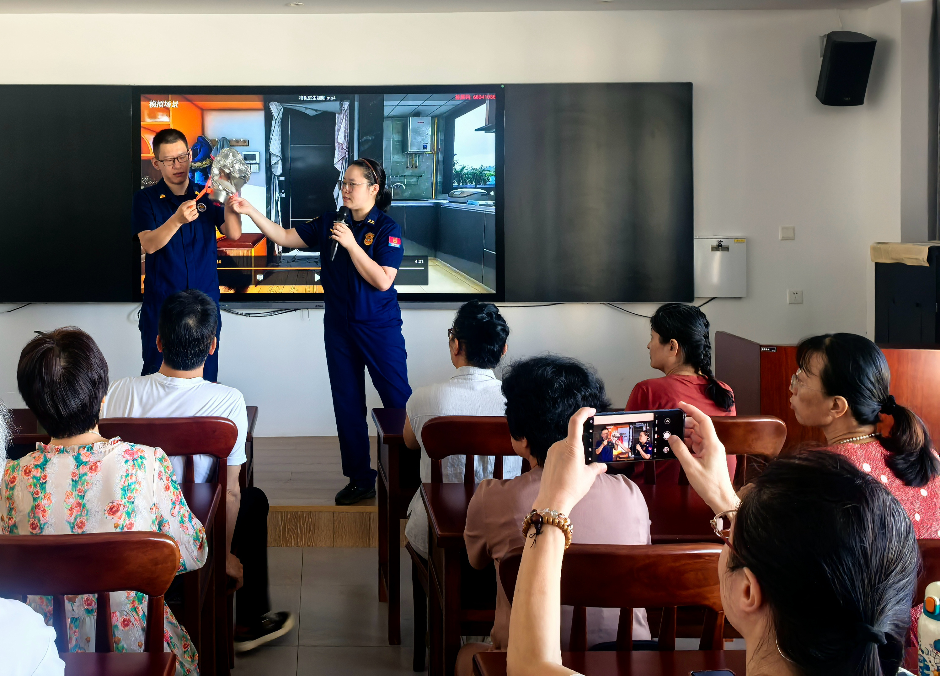 活动现场,消防宣讲员运用精心制作的模拟逃生视频,通过对“小火快跑、浓烟关门”这一核心口诀的逐帧画面剖析,引导老人们学习不同火场情境下的应对策略。消防宣讲员还逐一讲解灭火器、防烟面罩及灭火毯等常见消防器材使用要领与辨别技巧,并现场演示操作。