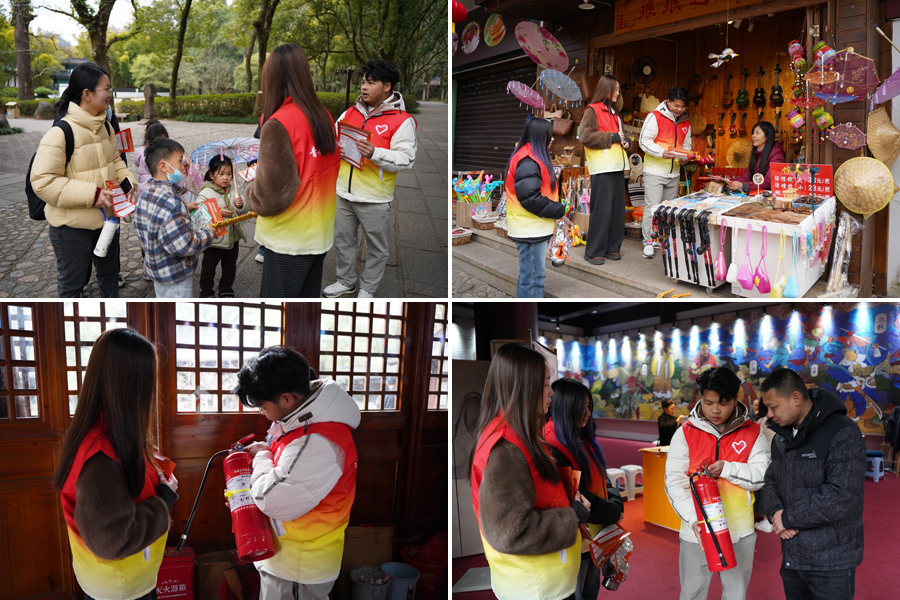 与此同时,武夷山大队组织大学生志愿者走进景区南门入口及武夷宫沿街商铺开展精准宣传。志愿者们重点向店主和游客普及消防安全知识:“老板,春节期间人流密集,电气线路要定期检查,灭火器要放在显眼易取的位置,切勿占用消防通道堆放货物。”他们手把手指导商户和游客使用防烟面罩,协助店主排查电气线路老化、消防器材过期等隐患,并发放消防主题钥匙扣、应急手电筒等实用周边产品,同步送上定制新春福贴,让安全防护与新春祝福一同融入日常。游客们接过兼具实用性与纪念意义的消防礼品,纷纷表示:“既能感受武夷山水之美,又能学到实用消防技能,这份‘平安福’太贴心了!”